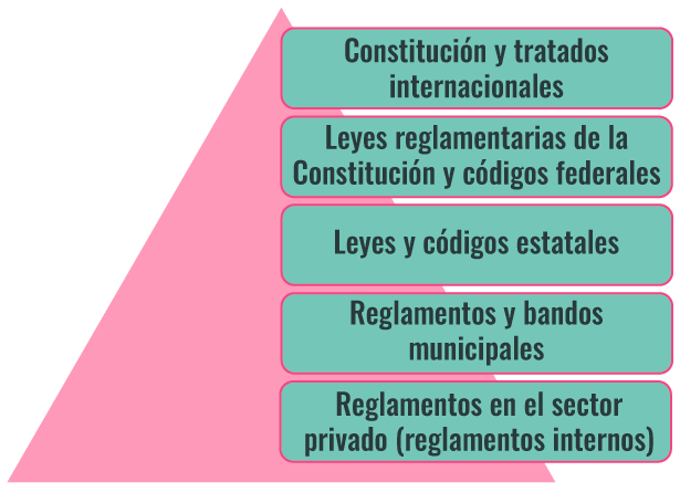 Es preciso recalcar que los reglamentos internos no deben contraponerse a las leyes de mayor jerarquía, de lo contrario no serán válidos. Como información importante, conviene revisar la siguiente pirámide de la jerarquía de las leyes mexicanas.